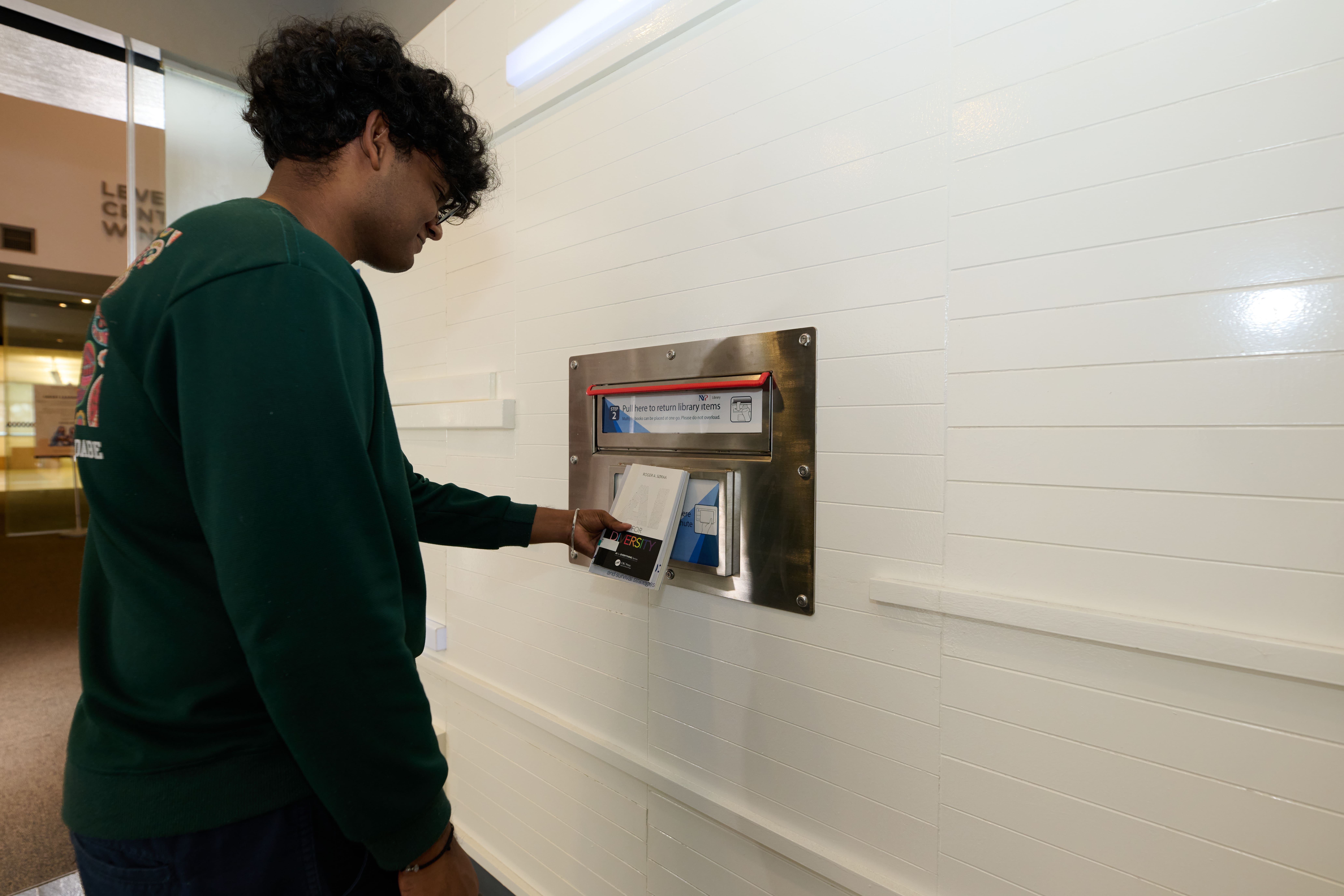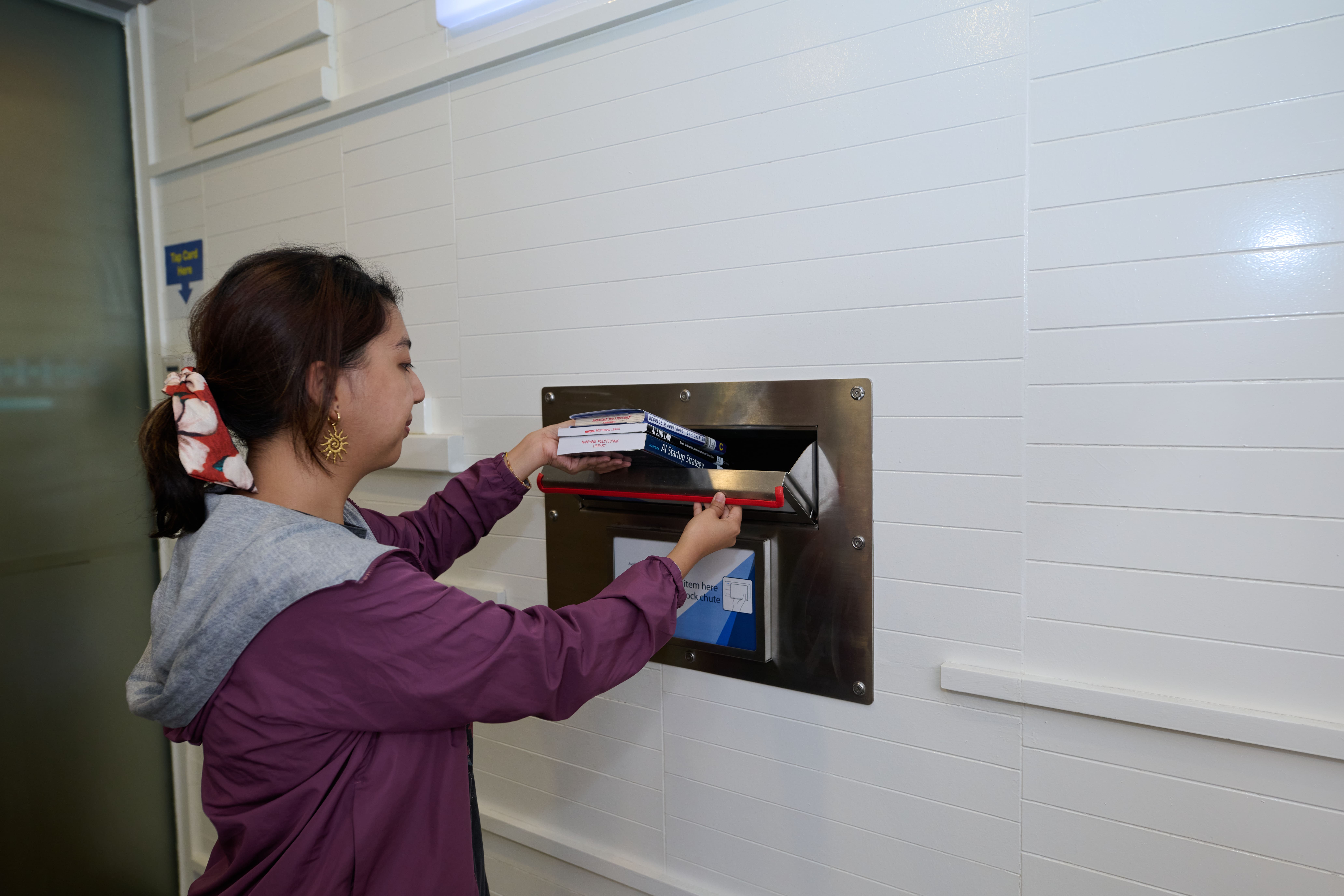 Tap the book’s RFID tag on the sensor to unlock the book drop.